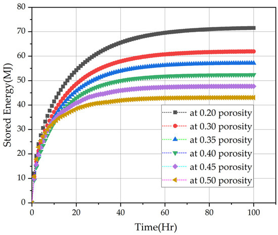 Figure 18 illustrates the energy stored during charging for different porosities. The maximum thermal energy is stored at a porosity value of 0.2. This is primarily due to the greater volumetric heat content of the rock. Porosities above 0.4 have higher airflow velocity at the beginning of the charging process, resulting in fast charging for porosities of 0.45 and 0.5. Consequently, the natural convection heat transfer plays a more significant role than the volumetric heat content in these cases, leading to faster energy storage compared to porosities of 0.35 and 0.4. In research conducted by Andreozzi et al. [26], comparable results were noted. Higher porosity values initially correlate with increased stored energy, but over time, this tendency reversed, with lower porosity values leading to increases in stored thermal energy. The stored thermal energy ultimately reached a saturation point for the range of porosity values considered in this study. Lower porosity values attain their thermal saturation faster than the higher porosity values, as shown in Figure 18.