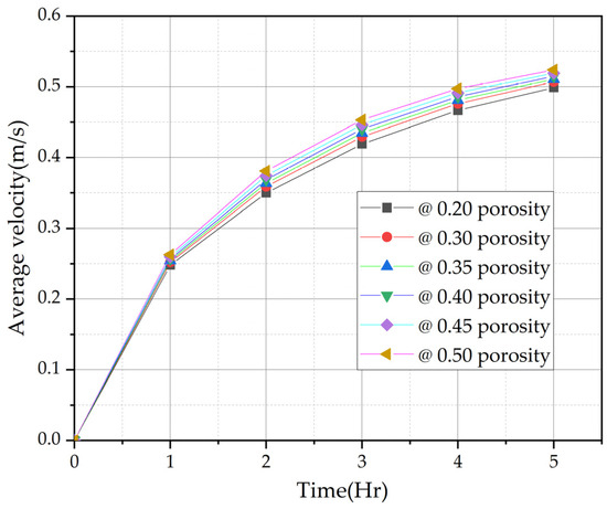 To improve the convective heat transfer within the storage, forced air circulation was simulated. Figure 19 presents the average flow velocity over time at various porosity values for the case of forced convection heat transfer. In contrast to natural convection, the flow velocity continues to increase in the case of forced convection. Compared to natural convection, higher flow velocity facilitates the heat transfer in thermal energy storage. This is evident in the temperature contour, which shows that TES can be charged to an average temperature of 228 °C in 5 h (as shown in Figure 20), compared to 220 °C in 50 h for the natural convection.