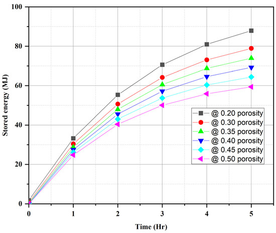 The amount of energy stored during the charging period is shown in Figure 21. The energy stored is higher for lower porosity values throughout the charging process. In the case of forced convection heat transfer, the effect of volumetric heat content is greater than that of the temperature gradient. A highly comparable outcome was obtained by Andreazzi et al. [43], indicating that reducing porosity results in longer charging and discharging times due to the increased thermal capacity. Conversely, increasing the porosity value leads to the attainment of steady-state conditions in both charging and discharging phases within a shorter timeframe. Moreover, within the same paper, it is underlined that the achievement of steady-state occurs at a decreased time interval owing to an enhanced convective heat transfer efficiency between the fluid and the solid matrix.