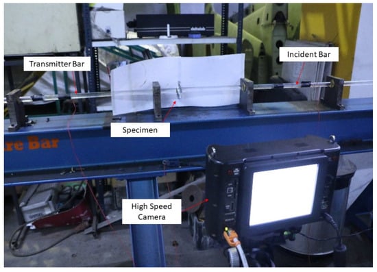 The dynamic compression is performed using a Split-Hopkinson Bar setup, which comprises the impactor bar, the incident bar, and the transmitter bar. The specimen is put in between the incident and the transmitter bar. For this experiment, a high-speed camera is also used to observe the compression and rebound of the specimen and to measure the speed of the impactor bar. The setup of the experiment is shown in Figure 1. The specimen is tested at four loading speeds—10 m/s, 15 m/s, 20 m/s, and 30 m/s—to measure the material’s strain rate and observe the effect of the strain rate on the specimen’s stress–strain response.