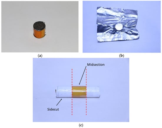 The Li-ion NCA 18650 jellyroll was sourced from a battery jellyroll producer. The jellyroll is cut using a lathe machine to obtain the desired specimen dimension for the dry specimen, as shown in Figure 2. Before the cutting process, the protruding metal tab is removed, and then the jellyroll is wrapped with a layer of cellophane tape to ensure that the jellyroll will not disintegrate during the cutting process. Since the length of the specimen used is constrained by the limitation of the SHPB test, two sections of the specimen will be tested in the static test, the midsection and sidecut, as shown in Figure 2.