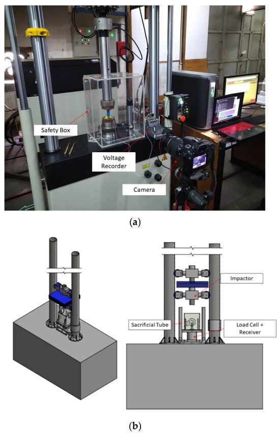 Three parameters are measured in both static and dynamic tests: force, displacement, and battery voltage. In the static compression test, the force and the displacement are measured directly from the sensors of the UTM, and the voltage is measured using a 100 kHz voltage recorder, which continuously measures the voltage of the battery during the testing. For the dynamic test, the force is measured using a 44 kN Piezoelectric load cell, the displacement is measured from a video recorded by a high-speed camera, and the voltage is measured using the 100 kHz voltage recorder. The testing setup for static and dynamic compression is shown in Figure 3.