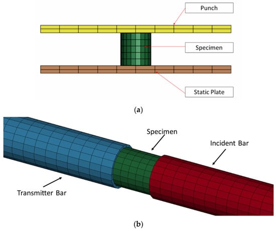 The numerical models of each of the static and dynamic compressions were made using LS-DYNA ver. 2021 to simulate the stress–strain response obtained from the experiment. The dimensions of the bars and the specimen used in the simulation are tabulated in Table 1. For the static simulation, the bars are replaced with a flat plate to replicate the puncher and the static plate, as shown in Figure 4. The bars, the plates, and the specimen are modeled using solid elements.