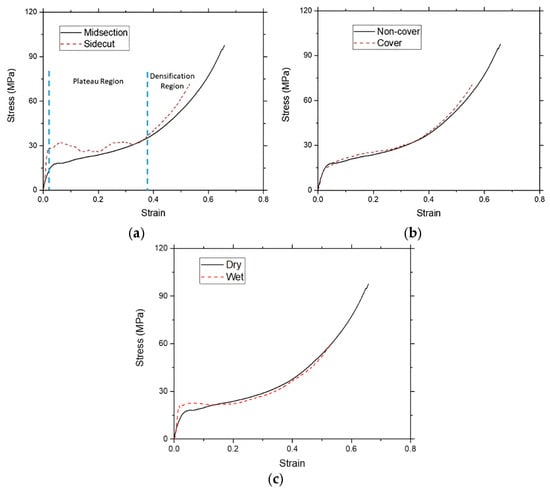 (a) Average stress–strain response for midsection and sidecut jellyroll on static compression, (b) dry jellyroll with aluminum cover and non-covered jellyroll, (c) and wetted and dry jellyroll. The plateau region is marked when the material reaches the yield point. The densification region is marked when the stress increases exponentially.