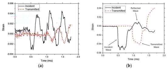 Strain wave results of the (a) AISI 4340 and (b) PMMA bars.