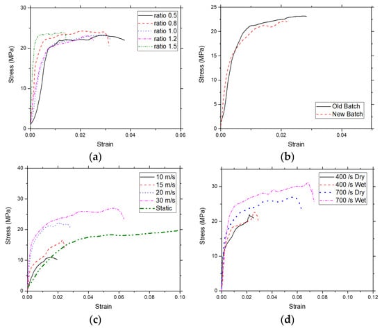 For the effect of the production batch on the stress–strain result, the test is performed with the same loading speed at 20 m/s, the same L/D value, and using a dry specimen. Figure 7b shows the stress–strain response from specimens with different production batches. There is no significant variance in the stress response from both batches. The noticeable difference is from the strain at the unloading phase, where the old batch’s specimen has a slightly longer strain than the newer batch. This difference has no major impact as the strain at the unloading phase is commonly not used unless there is an interesting phenomenon that occurs in that region. Thus, the difference in production batch has no immediate major impact on the stress-strain result.