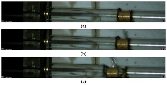 An interesting phenomenon occurred during the compressing process of the jellyroll. From Figure 8, it is shown that the specimen does not retain its maximum deformation. In Figure 8b, the compression buckling is visible on the surface of the jellyroll as indicated by the reflected light. However, in Figure 8c, the surface of the specimen does not show any buckling on the surface, which indicates that there is an unloading process immediately after the maximum compression is over. This process would create a slightly longer strain wave during the decompression stage, as shown in Section 3.2.2.