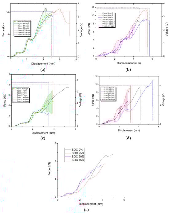 Force, displacement, and voltage curves from the static compression test at (a) 0% SOC, (b) 25% SOC, (c) 50% SOC, and (d) 75% SOC. (e) Comparison of the force–displacement responses at different SOC values.