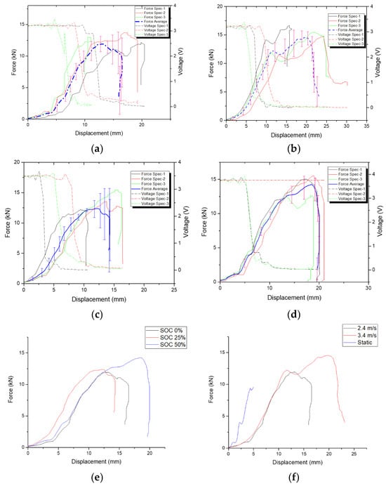 Force, displacement, and voltage curves from dynamic compression test on (a) 0% SOC, 0.5 m, (b) 0% SOC, 1 m, (c) 25% SOC, 0.5 m, (d) 50% SOC, 0.5. (e) Comparison of average force–displacement responses with variations in SOC. (f) Comparison of average force–displacement response with variations in loading speed at 0% SOC.