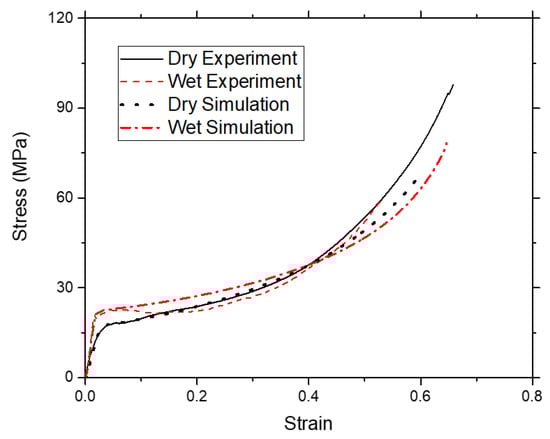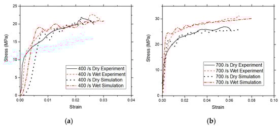 The Fu-Chang model is also used to model the stress–strain response of the jellyroll in wet and dry conditions at the strain rates of 400/s and 700/s. Figure 13 shows the comparison between the simulation and the experiment results. The simulation results are well correlated with the average of the experiment results in both wet and dry conditions at two strain rate values using the material input given in Table 2.