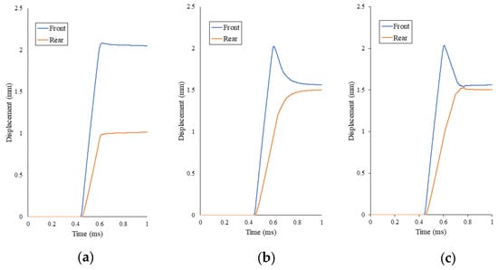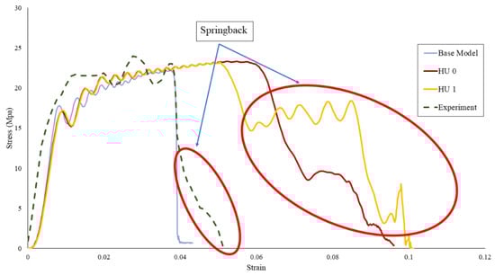 The rebounding effect of the specimen after the dynamic compression using the SHPB would lengthen the strain response after peak compression. The added strain due to the unloading of the jellyroll can be modeled using the Fu-Chang foam by simply adjusting the shape and the hysteretic unloading factor (HU) of the material model. The effect on the specimen’s final deformation by varying the shape and the hysteretic unloading was also recorded. The specimen’s unloading behavior during the experiment could be simulated, as shown in Figure 14, in correlation with the results in Figure 15. The results of the base model show that the specimen retains its deformation since the front and rear surfaces have different displacements. For models with HU of 0 and 1, the displacement of the front side of the specimen gets closer to the displacement of the rear side, which indicates a rebounding phenomenon of the specimen after compression.