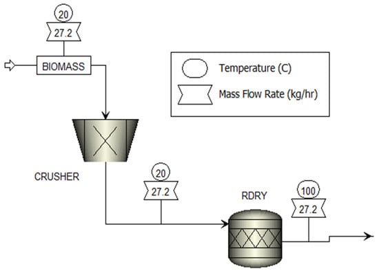 The biomass passes through a crusher (CRUSHER) resulting in a uniform biomass particle size of 2 cm, then enters the drying section involving a stoichiometric reactor (RDRY) where it decomposes the biomass at the moisture percentage, which, in the case of this project, is 8.7%. Subsequently, the water is separated using the SEP equipment, in which all the water content is separated, and the dried biomass (BIODRY) enters the pyrolysis or decomposition reactor; during this section the operational temperature range is between 200 and 400 °C. This process is illustrated in Figure 1.