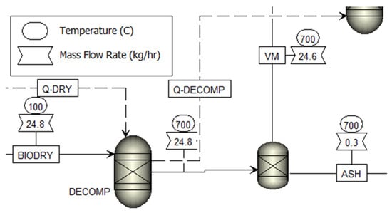 The pyrolysis in the simulation model will consist of the decomposition of the raw material into its elemental components (H, C, N, O, S) in a yield reactor (DECOMP) [30]. The yields of these components are based on the proximate and elemental analysis of the biomass. This decomposition also includes the ashes (ASH), which will be separated in a continuous separation equipment SEP after the reactor, separating the volatile material from the ashes. During this section, the operational temperature range is between 400 and 700 °C.