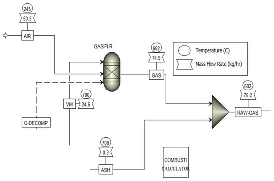 The properties for all conventional components are estimated using the Peng–Robinson equations because their use corresponds to non-polar or slightly polar mixtures, such as hydrocarbons, carbon oxides, and simple gases [34]. On the other hand, for the estimation of non-conventional components defined by biomass and ash, structured in the simulation as “biomass” and “ash”, respectively, their enthalpy and density are estimated using the HCOALGEN and DCOALGEN models (models focused on materials with various carbon contents that define these properties based on proximal and elemental analysis). These methods have also been employed in other studies [35].