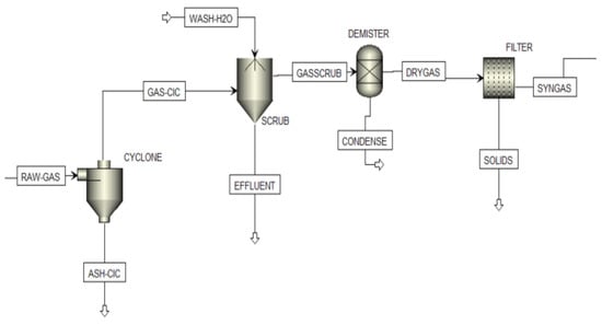 The purification section is carried out based on the main parameters from [31], using cyclone equipment, a gas scrubber, and a bag filter to remove solid tar residues and ashes, resulting in a synthesis gas free of impurities and residues. It is worth noting that the particle size, as explained in the assumptions, remains constant throughout the equipment, and, therefore, the separation of residues is based on the separation efficiencies of the equipment.
