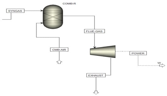 The gasification section consists of a Gibbs reactor where the gasifying agent, which is air, enters, and then it goes into a mixer for a stream with residues according to reality. During this section, the operational temperature range is between 800 and 1000 °C.
