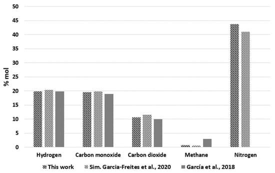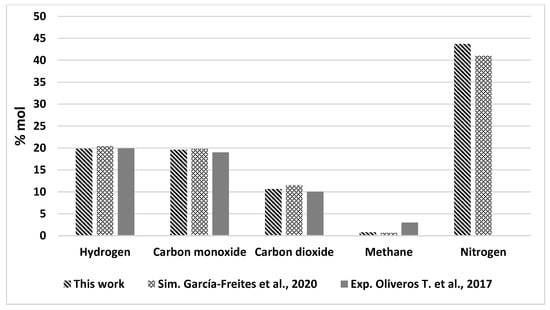 Regarding the composition of methane and nitrogen in both comparison groups, the concentration of these, mainly methane, tends to be much lower than indicated by experimental values. This is because the simulation model is based on chemical equilibrium, and the methane formation given by the methanation reaction decreases for temperatures above 800 °C [40].