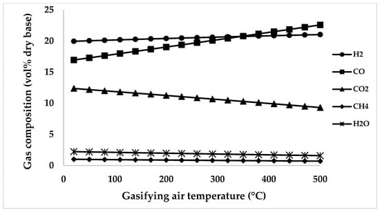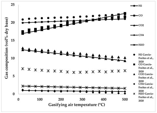 Finally, in Figure 8, the composition profiles of the synthesis gas are compared [31] by varying the air temperature to determine the consistency in the obtained data. The following data are obtained.