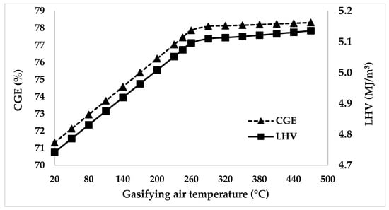 Heating value and cold gas efficiency as a function of gasifying air temperature.