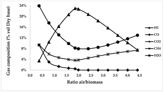The change in its composition as a function of ER was experimentally measured by [22]. They evaluated the composition profile also with respect to the ratio between the gasifying agent flow and the biomass. These relationships allow for an adequate visualization of each component, facilitating decision making based on the amount of gasifying agent flow to use to improve the quality of the syngas and reduce residue formation.