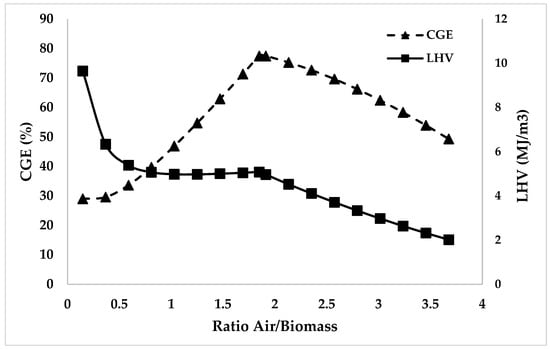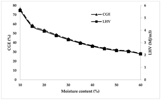 Cold gas efficiency (CGE) is one of the most important parameters for evaluating the biomass gasification process. It is explained that CGE is an indicative parameter of the system’s ability to harness the energy content of biomass, transforming it into available energy in the synthesis gas. This parameter is defined as the percentage of the energy content of biomass in relation to the energy content of the syngas [38]. Energy deficiency implies shortcomings in the gasifier [39]. A related situation would be biomass with high moisture content, as it causes a decrease in the gasifier temperature and requires additional energy consumption for drying to meet the necessary requirements to proceed to the pyrolysis section. The additional moisture contributes to a decrease in syngas quality and promotes tar formation.