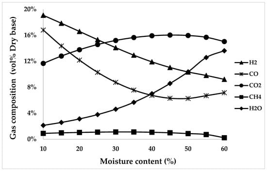 The moisture content varies depending on the raw material to be gasified and is a determining factor as it involves energy consumption for drying the material [23]. Energy consumption is proportional to the material’s moisture and can also lead to changes in the syngas composition [24]. Moisture content implies a decrease in the quality of synthesis gas for the formation of compounds that contribute to the calorific value of the gas mixture, such as methane, hydrogen, and carbon monoxide. This is because water favors the formation of carbon dioxide, which does not contribute to the calorific value of the product. Additionally, for moisture values above 35%, hydrogen is reduced due to water formation in total combustion reactions. Since hydrogen is the main compound contributing to the calorific value of the process, it is not advisable to allow its reduction. The author [25] finds that low moisture values benefit the gasification process primarily due to the minimization of residue formation. They also analyze this parameter through the energy criteria of the produced syngas, observing that the calorific value varies minimally as moisture increases. The important factors are the tar fraction and the cold gas efficiency (CGE), which are minimum and maximum, respectively, at low moisture levels. The thermal efficiency of the process will be proportional to the moisture content of the biomass due to the increased energy demand for drying and a decrease in the quality of the syngas.