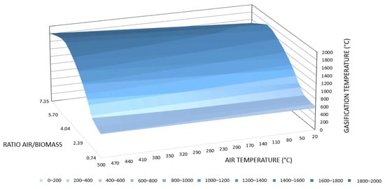 Ratio air/biomass and air temperature as a function of gasification temperature.