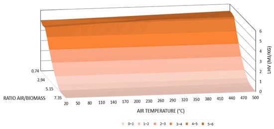 Ratio air/biomass and air temperature as a function of lower heating value (LHV).