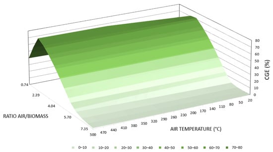 Ratio air/biomass and air temperature as a function of cold gas efficiency (CGE).
