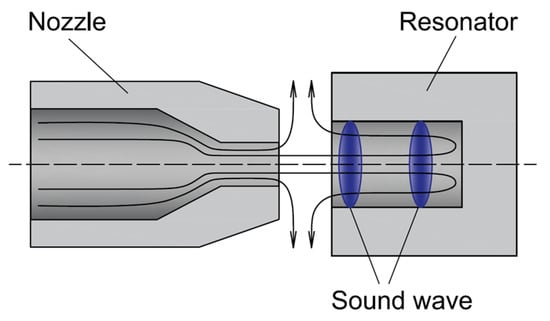 Flow ultrasound generators are devices that emit high-frequency sound waves due to the hydrodynamic instability of the supersonic flow between the nozzle and the cylindrical resonator []. Ultrasound generators are used to intensify chemical reactions for the mechanical cleaning of surfaces and to reduce the viscosity of a medium [,]. The design of the simplest ultrasound generator is shown in Figure 1.