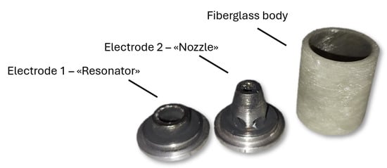 A spark gap arrester sample with the design features of the ultrasound generator was manufactured and tested. Figure 3 shows an example of a spark gap arrester in disassembled state after testing. The example consists of a fiberglass body and two steel electrodes. The electrodes also serve as end caps.