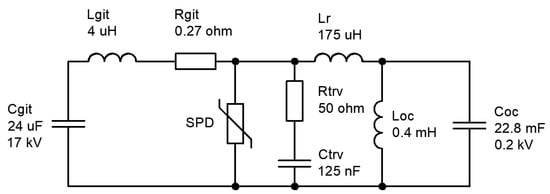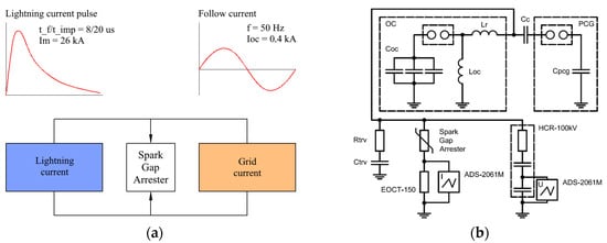 The block diagram and electrical diagram of the high-voltage test bench used for the arrester tests are shown in Figure 4a,b, respectively. The arrester was connected in parallel to a pulse current generator (PCG) and to an oscillatory circuit (OC).