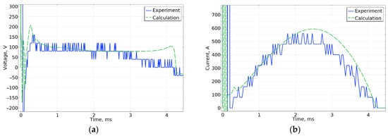 Figure 7 shows comparisons of the time dependences of the current and voltage obtained as a result of numerical modeling and as a result of the experiment.