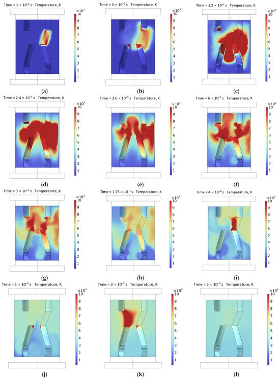 Temperature distributions at various points in time: (a) 1 μs; (b) 4 μs; (c) 12 μs; (d) 24 μs; (e) 36 μs; (f) 60 μs; (g) 90 μs; (h) 175 μs; (i) 400 μs; (j) 1 ms; (k) 3 ms; (l) 5 ms.