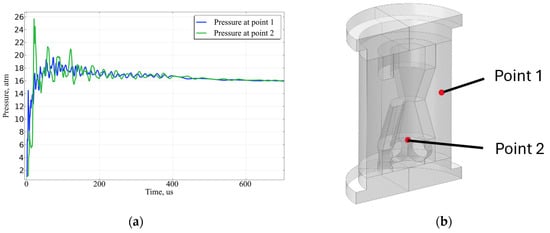 Time dependencies of pressure: (a) comparison of time dependencies of pressure at points 1 and 2 obtained by numerical simulations; (b) the location of points 1 and 2 inside the spark gap arrester.