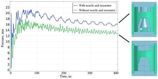Comparison of time dependencies of pressure in the spark gap region for the spark gap arrester designs with and without a nozzle and resonator.