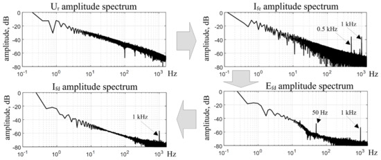 Ifd should be recognized as a result of applying the Efd signal to the rotor winding of the generator. The application is executed through slip rings. The massive inductance and the influence of the armature circuit of the generator have the greatest impact on the parameters of this signal [19]. The Ifd waveform is generally even smoother than the Ife (Figure 2). The removable discontinuities can be observed at 0.8, 1.4, and 4.3 s. The total interference level seems to be even higher than for the Ife, and its main source is the noise and harmonic component at f = 1 kHz (with an amplitude about 20 dB higher than the noise floor), which is observable in the amplitude spectrum of the signal (Figure 3)