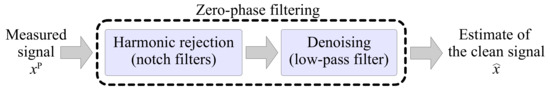 The SASS method will be compared with a reference LTI noise and harmonic rejection method based on a low-pass filter for denoising and notch filters for harmonic rejection. These filters are one of the typical first-choice methods in the case of denoising (low-pass filters) and harmonic rejection (notch filters) [20,24,36]. A block diagram of this method is presented in Figure 4.