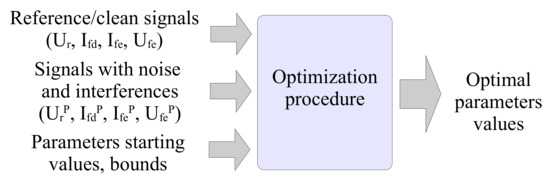 The input data for the optimization process includes the model-generated reference/clean signals, the test signals that have been subjected to added noise and harmonic interference (with further details about these signals provided in Section 7), and the initial parameter values for the optimization procedure. The effectiveness of each filtering method is evaluated by comparing the filtered noisy signals to their corresponding reference signals (as outlined in Equations (18) and (19)), which will be discussed in detail later in this section.