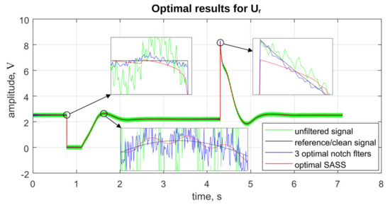 In the case of the regulator voltage Ur, the maximal error was significantly smaller for optimal LTI filters (58%) as compared to optimal SASS (110%). At the same time, the corresponding RMS error is smaller for optimal SASS (7%) than for the optimal LTI filters (14%). It is important to mention that the optimal LTI result was achieved for three narrow-band notch filters (without the low-pass filter), which means that the optimal LTI case filters out just the harmonic components. On the other hand, the optimal SASS method works well when removing the noise component but finds it problematic to deal with the harmonic components (the removable discontinuity artifacts are introduced to the signal in the harmonic zero-crossing points).