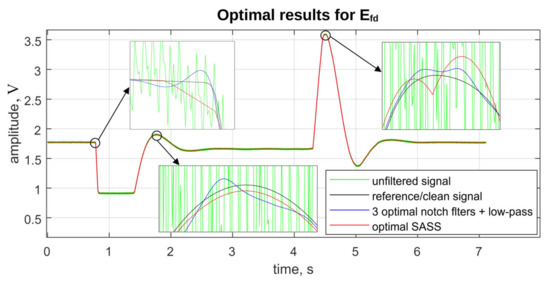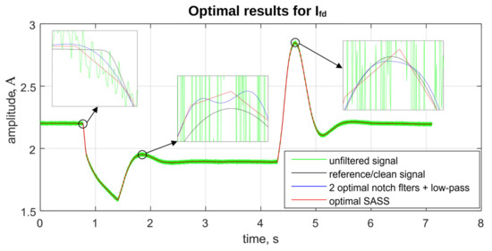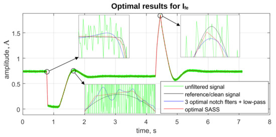 In the case of the field current Ifd, all three parameters are better for the LTI method based on two notch filters combined with the low-pass filter. It means that for this particular signal, the low-pass filter does not affect the slopes significantly enough to let the optimal SASS method win. This suggests that for signals which can be considered “smooth enough”, a typical low-pass filter might be sufficient as a wide-band denoising filter.