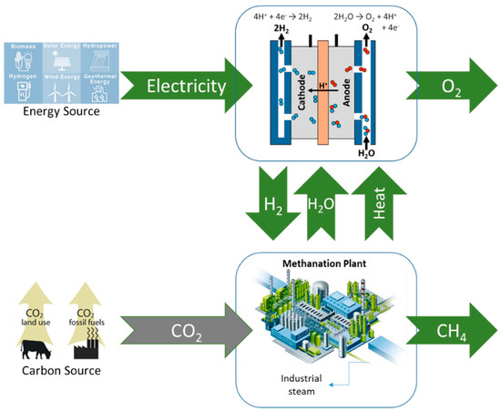 The European process concept follows the Japanese one, though their R&D efforts broaden the water electrolysis window to a wider range of electrolyzers. In this case, rather than considering a recycling of CO2, they also generalize it to emission valorization. Thus, the PtG concept developed in Japan, as well as in Germany, Switzerland, Denmark, and France, can be represented by the scheme shown in Figure 1. The main drawbacks of PtG are relatively low efficiency and high costs. The process economy was largely influenced by RNG production costs, which were strongly dependent on the annual operational time and the electricity price [13].