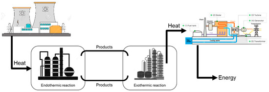 Another early study was the A&E process based on the chemical heat pipe concept (see Figure 2), which involves producing a chemical energy carrier through an endothermic reaction and transporting it to a remote location where it could be converted back to energy or to other chemical products. It was first tested in Germany using heat from a high-temperature gas-cooled nuclear reactor for the first half cycle (EVA, from the German term “Einzelrohr-Versuchs-Anlage”, meaning single-tube experimental facility) to produce synthesis gas (syngas, a mixture of carbon monoxide and hydrogen), by methane steam reforming (SMR, the endothermic reaction (R2)). The Adam half-cycle of the process was run in a distant location and consisted of the methanation reaction of syngas (an exothermic reaction, (R3)). The methanation heat of reaction could be used for electricity generation or any other process heat [27].