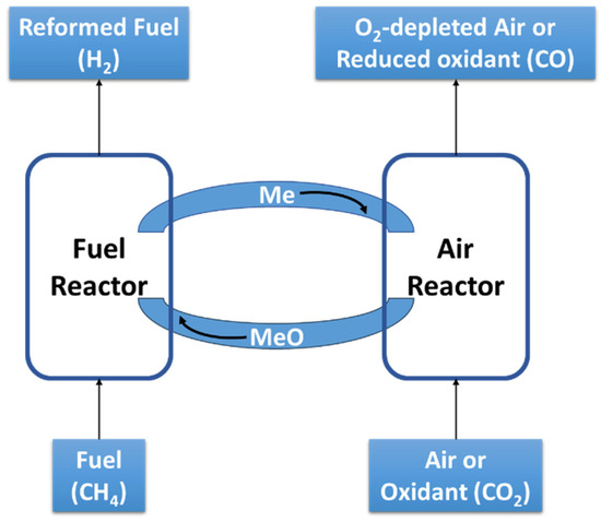 Chemical looping (CL) is a type of thermochemical cycle to transport oxygen within a reacting system. The original conception of the thermochemical cycles was to combine heat sources with chemical reactions that disaggregate molecules. Chemical compounds are continuously recycled in these processes, creating closed loops by integrating two hemi-cycles [170]. Buelens et al. [171] have described the particular case involving CO2 in CL through three types of processes, namely, thermal redox, chemical redox, and carbonation. As illustrated in Figure 5, in the first half cycle (hemicycle 1, (R11)), an oxidant (redox CLs) or CO2 (carbonation CL) reacts with a metal (Me) or a metal oxide (MeO), respectively, in the so-called “Air Reactor”. Meanwhile, in hemicycle 2 (R12), a reductant (chemical) or heat (thermal and carbonation) is used to restore the initial compounds in the Fuel Reactor.