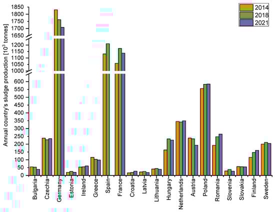 In Europe, the total reported amount of sludge generated in 20 selected EU countries was 6464.37 thousand tons in 2014, which then increased to 6792.94 thousand tons in 2018. The year 2021 already shows a total decline, which is difficult to interpret, but this result is significantly influenced by the lack of reporting data for Spain. In 2021, we had a declared decrease in EUROSTAT data to 5451.98 thousand tons. The decline in sewage sludge production may also reflect the impact of improved environmental policies and technological advances in wastewater treatment, which focus on waste reduction and improved plant efficiency and recovery of possible nutrients (Figure 1).