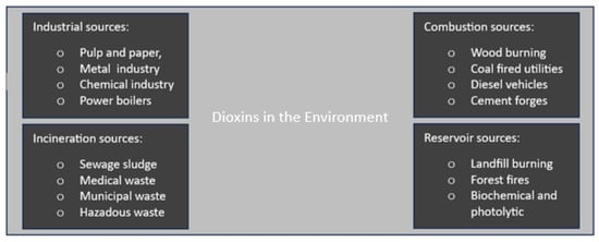 Thermochemical processing of sewage sludge, such as pyrolysis and gasification, may produce pollutants, including dioxins, furans, and solid particles. Dioxins and furans are toxic and can be emitted during high-temperature processes if improperly controlled. Particulate matter, which contains heavy metals and other harmful substances, can also be emitted, affecting air quality. Emission controls, including filters and catalytic converters, are key to minimizing these pollutants []. Dioxins and furans are recognized as highly toxic organochlorine pollutants with significant detrimental effects on public health and major economic repercussions. These compounds include polychlorinated dibenzo-p-dioxins, dibenzofurans, and dioxin-like substances such as polychlorinated biphenyls and carbazoles. Classified as persistent organic pollutants, they are featured in the Stockholm Convention’s “Dirty Dozen” list. They are also identified by the International Agency for Research on Cancer as Group 1 carcinogens, indicating that they are known to cause cancer in humans []. Figure 3 below shows the main sources of dioxins in the environment. Therefore, many studies focus on the formation and control of dioxin and furan emissions during the pyrolysis of sewage sludge. One of them is research conducted by Cones’s team []. The author aimed to estimate the emission of dioxins and furans under various decomposition conditions. This made obtaining an approximation of waste distribution in real conditions possible. A group of researchers from Iceland [] analyzed the formation of dioxins in the gasification process and the operational parameters that can be controlled during the process to minimize the formation of dioxins. The authors note that using a high-temperature reactor at temperatures above 800 °C, combined with rapid gas cooling and the absence of oxygen, significantly reduces the formation of dioxins. This method is effective even for fuels with high chlorine content, demonstrating that high-temperature gasification can mitigate dioxin production under challenging conditions.