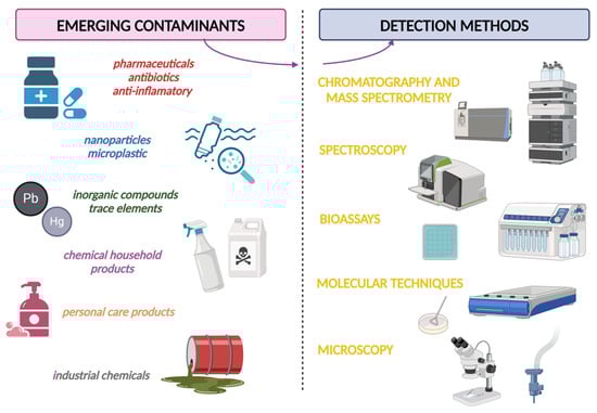 The assessment of environmental risk associated with using sewage sludge for fertilizer and energy purposes is complex and involves various analytical and modeling tools. These tools help to identify, quantify, and assess potential environmental and health risks associated with contaminants present in sewage sludge. Wastewater contaminants are mainly biodegradable during the treatment process, while the resistant ones are retained in sewage sludge to the greatest extent. Wastewater contains high levels of MPs, and most of them (≈99%) remain in sewage sludge []. Many are not biodegradable or only slightly biodegradable and have high water solubility. Therefore, pharmaceuticals and personal care products (PPCPs), endocrine disrupting chemicals (EDCs), such as bisphenol A (BPA) and phthalates, per- and polyfluoroalkyl substances (PFASs), known for their persistence in the environment, pose a major threat. For this reason, the presence of these contaminants in sewage sludge is associated with a potential threat, both in ecological and health terms (Figure 4). Therefore, it is important to monitor the total content of these contaminants in sewage sludge and their intermediate forms of decomposition. Emerging pollutants in sewage sludge, including pharmaceuticals, personal care products, endocrine-disrupting chemicals, and microplastics, pose increasing risks to human health and the environment []. Various scientific and technical analytical tools evaluate these contaminants in sewage sludge (Table 2).