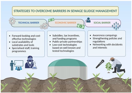 Overcoming economic barriers plays a crucial role in green transformation as well. In a real wastewater treatment plant case study, different scenarios with different sludge train technologies were assessed using the DSS-WWTP simulator. It was shown that although both thermal utilization and thermal hydrolysis showed the highest economic efficiency, thermal hydrolysis brought additional benefits in improving the heat balance of the entire wastewater treatment plant, even when combined with other technologies []. Implementing financial incentives such as subsidies, tax incentives, and funding programs can encourage adopting best practices and technologies. Public–private partnerships are also beneficial, as they leverage private sector investment and expertise, bringing innovative solutions and enhancing the overall effectiveness of sludge management programs. Focusing on cost-effective solutions, and prioritizing the implementation of technologies that offer significant benefits without high costs, ensures broader adoption and greater overall impact. Currently, in Europe, treatment plants pay for the collection of sludge by entities that deal with its storage or disposal. Therefore, the main goal of many wastewater treatment plant operators is to reduce sludge production to keep the costs of its disposal at an affordable level. In addition, rising energy costs force treatment plants to invest in new sludge nodes to maximize profits. Additional trends in Europe are the progressive reduction of landfill availability for waste disposal, increased local opposition to agricultural use, anticipated stricter standards for metals and emerging micropollutants under the upcoming European directive, and rising disposal costs for off-site solutions []. They are further trends that are largely generated by social barriers. Social approaches are equally important. Engaging communities in planning and decision-making promotes ownership, ensures solutions are tailored to local needs, and increases acceptance and compliance. Awareness campaigns to educate the public about the benefits and safety of proper sludge management can lead to greater community support and participation. Strengthening policies and regulations to ensure compliance and incentivize best practices is also essential. Robust policies and regulations, with incentives for compliance and penalties for non-compliance, ensure adherence to high standards in sludge management [].