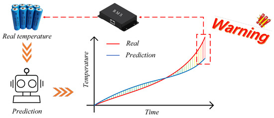 Lithium-ion batteries, due to their high energy density, long service life, and low self-discharge rate, have gained widespread application in electric vehicles, energy storage systems, and other fields [1]. The optimal operating temperature range for lithium-ion batteries is 20 °C to 40 °C [2]. If the battery materials continuously remain within abnormal temperature ranges, this can lead to accelerated degradation of the positive and negative electrode materials, electrolyte decomposition, and increased internal resistance, resulting in increased heat generation [3]. If cooling is inadequate and temperature rise is uncontrolled, it may trigger a thermal runaway process [4]. With the expansion of the new energy industry, incidents of fires are increasing, and over 90% of these incidents are attributed to thermal runaway of batteries [5]. As shown in Figure 1, constructing an accurate lithium-ion battery temperature prediction model can reveal future surface temperature trends. If the residuals between the predicted and actual values exceed a threshold, it indicates potential anomalies in the battery [6], and the battery’s operating state can be adjusted in advance based on the warning information to effectively prevent thermal runaway [7].