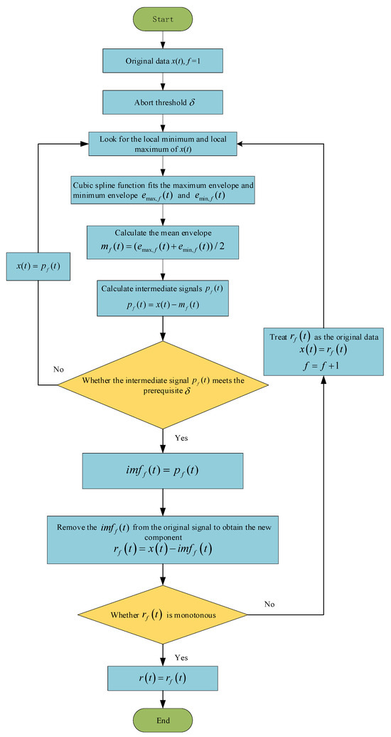 The core idea of EMD is to iteratively decompose the data from high frequency to low frequency into a series of IMFs and a residual component, according to the local temporal feature scale of the data, so as to achieve noise reduction and smoothing of the data [22]. The detailed decomposition steps are shown in Figure 2.